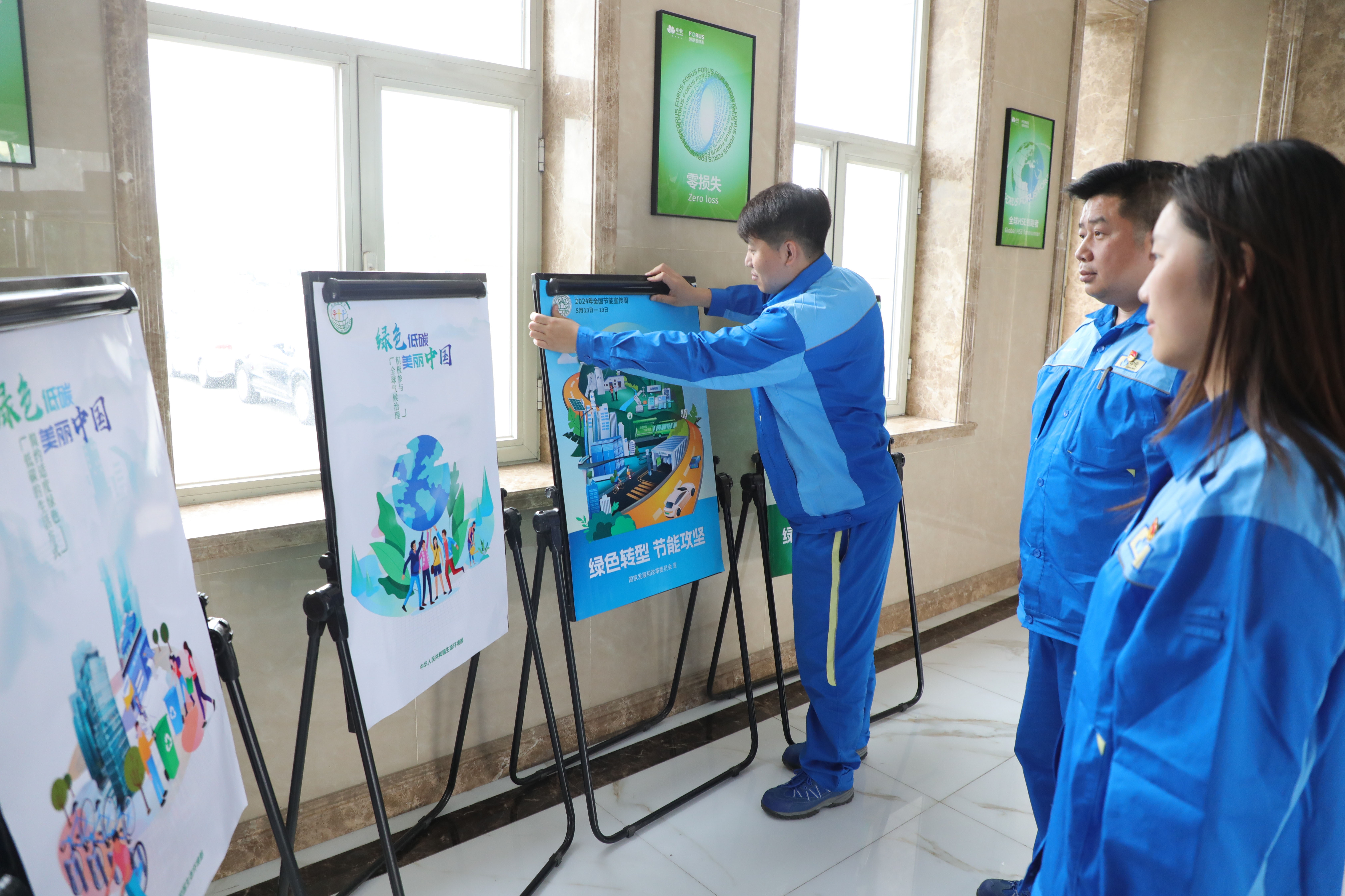 圖為沈陽化工員工正在張貼節(jié)能宣傳周海報(bào)?